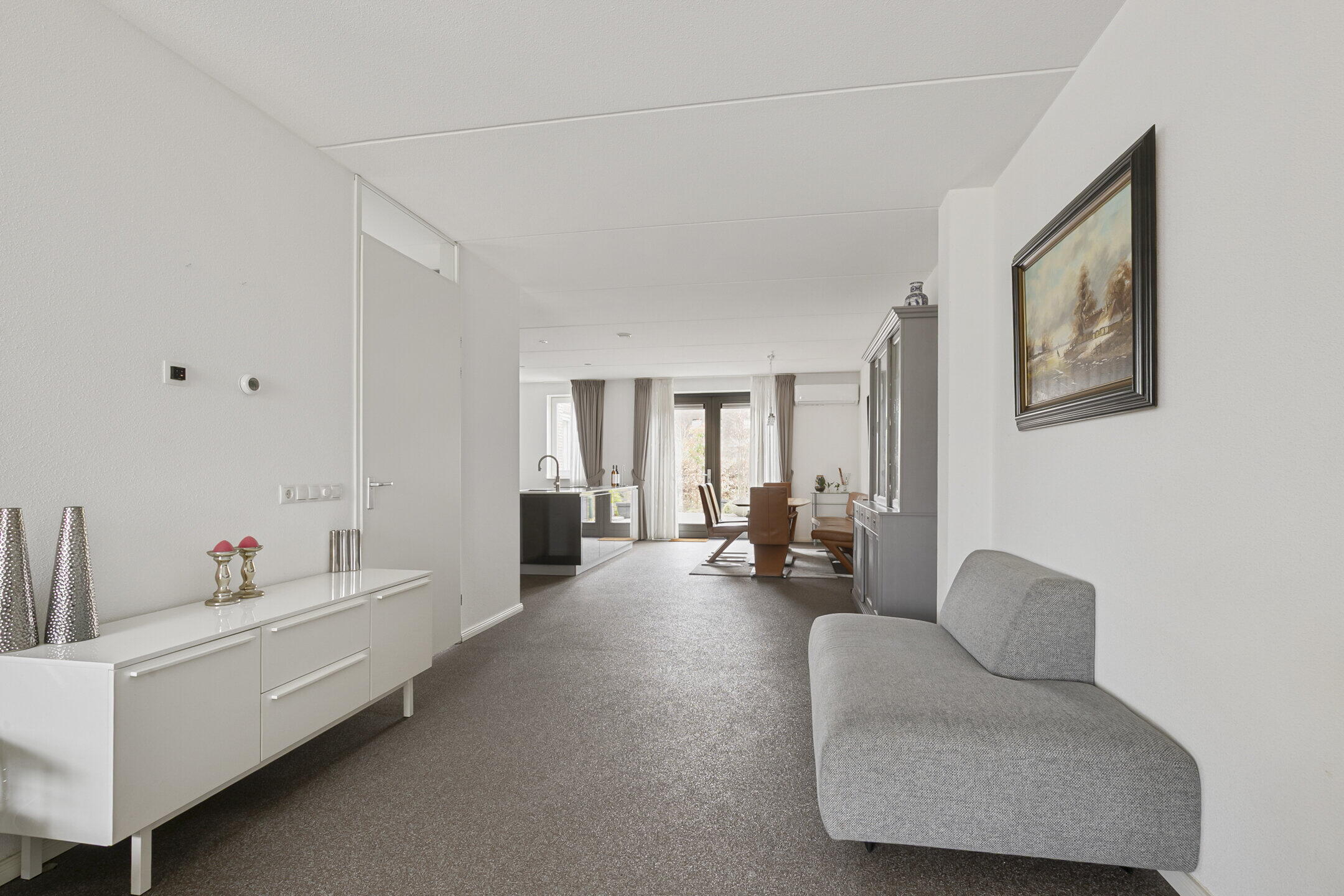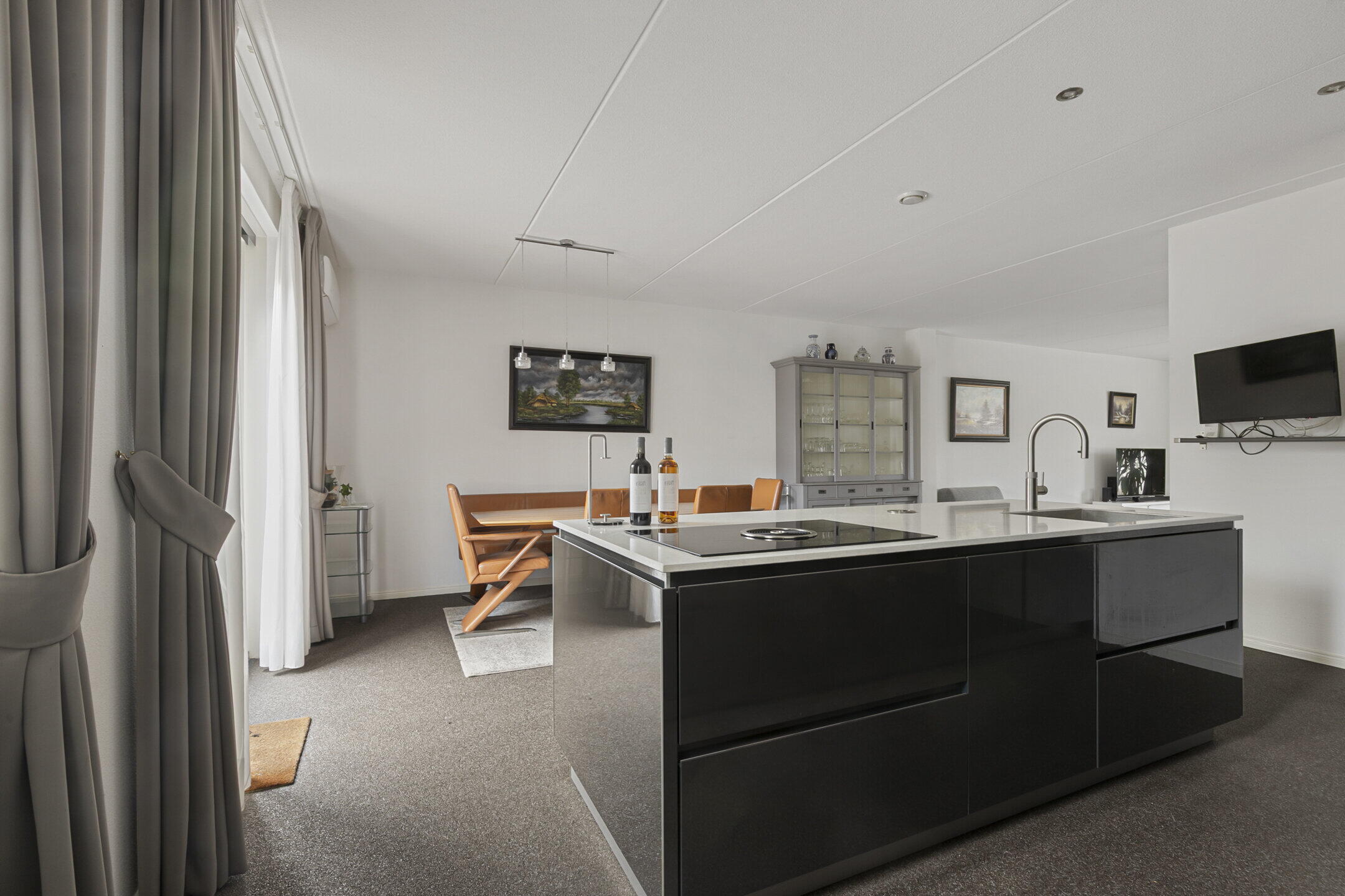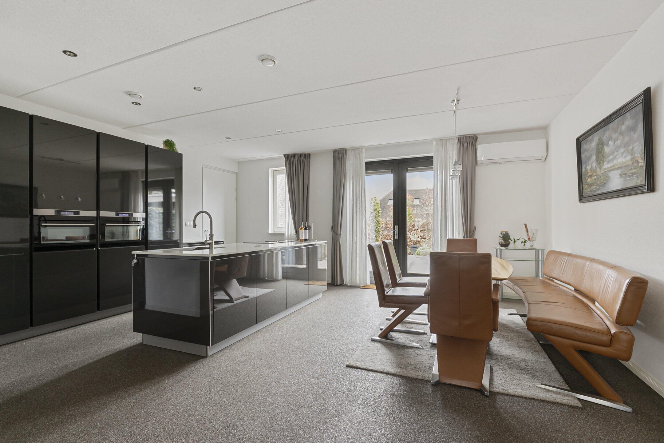 Entree van de woning in de hal. De hal is voorzien van het toilet met fonteintje, de meterkast, de trapopgang en er is ruimte voor de garderobe. Vanuit de hal is er toegang tot de woonkamer. Aan de voorzijde is de zithoek met erker wat zorgt voor een goed lichtinval en leuk uitzicht. Lopend naar de achterzijde is de opstelling van een ruime eethoek met hiernaast de luxe keuken. Er is een royaal eiland met veel kastruimte en een Bora inductiekookplaat met een geïntrigeerde afzuiging. Ook vindt je hier de ingebouwde vaatwasser en de Quooker. De hoge kastenwand heeft een grote inbouwkoelkast alsmede een grote inbouwvriezer, een oven en een combimagnetron. Tevens is hier ook nog kastruimte. Bij het eetgedeelte zijn er openslaande deuren naar het achtergelegen terras.