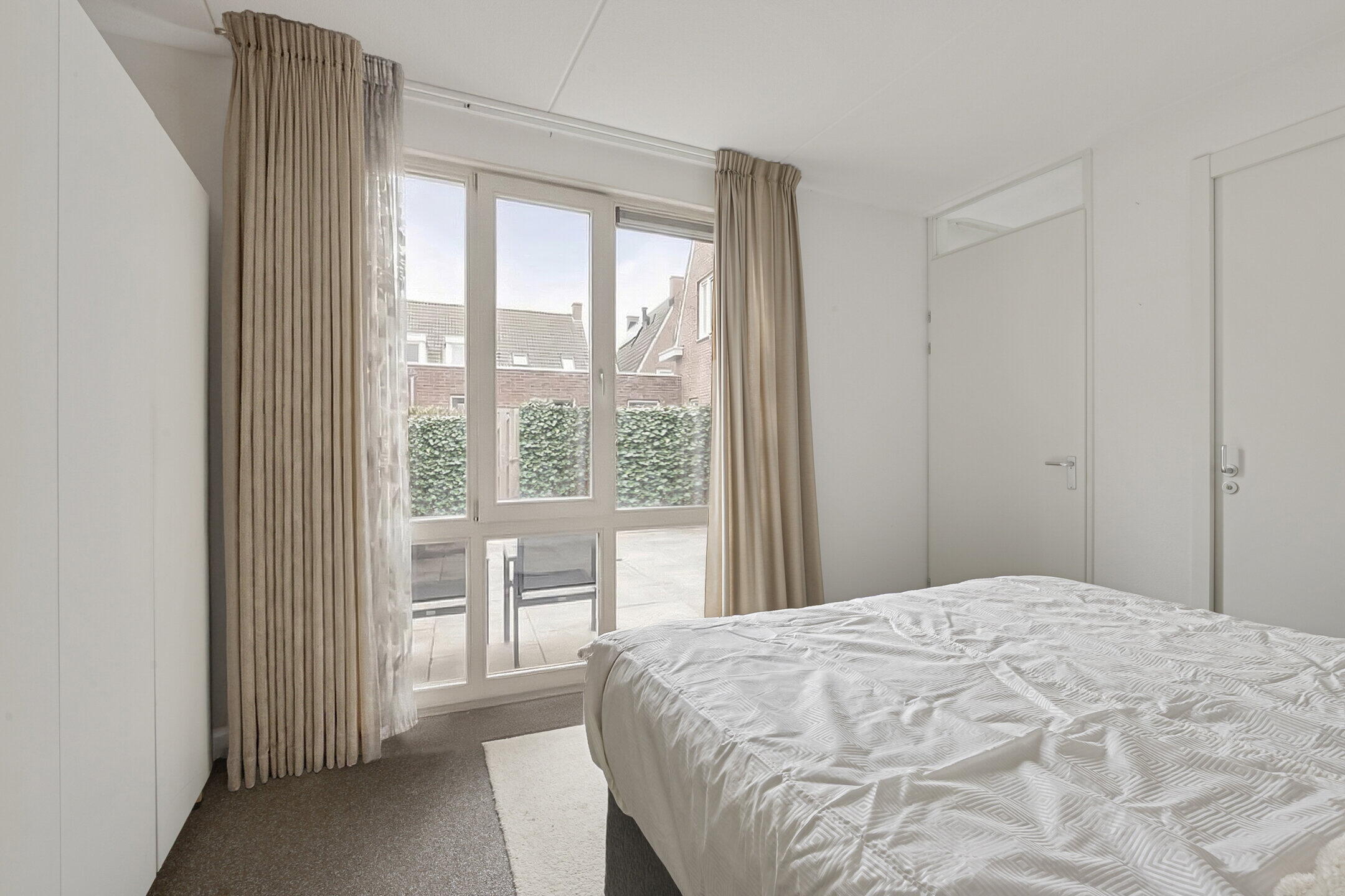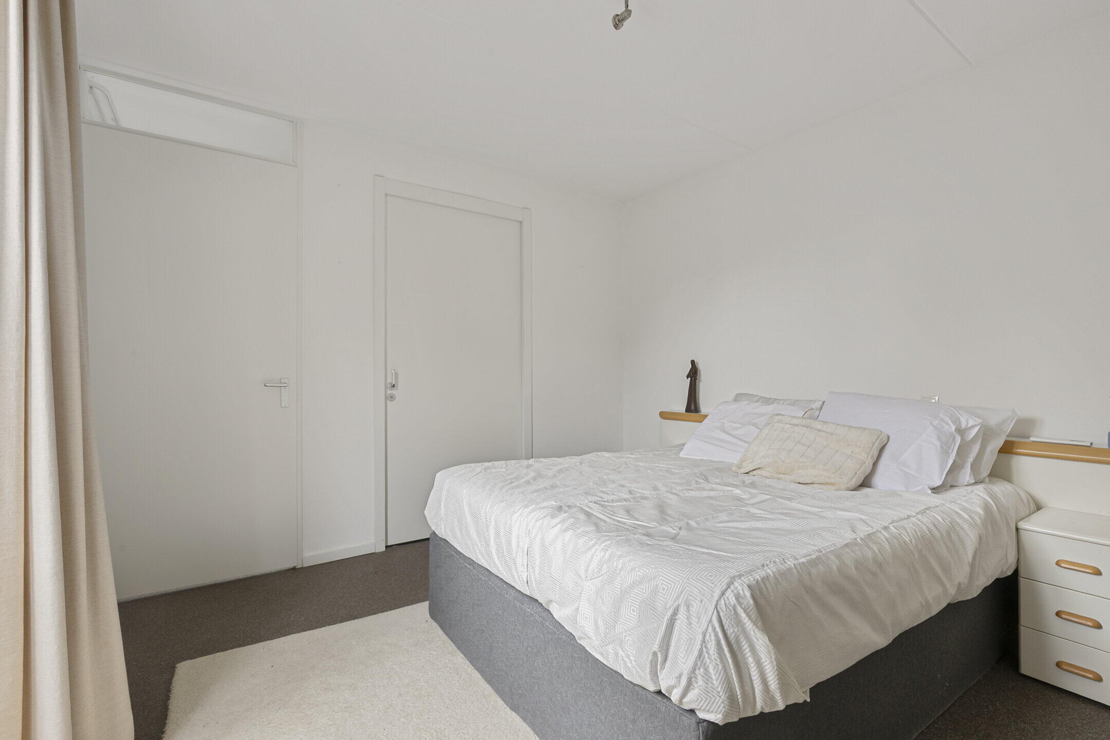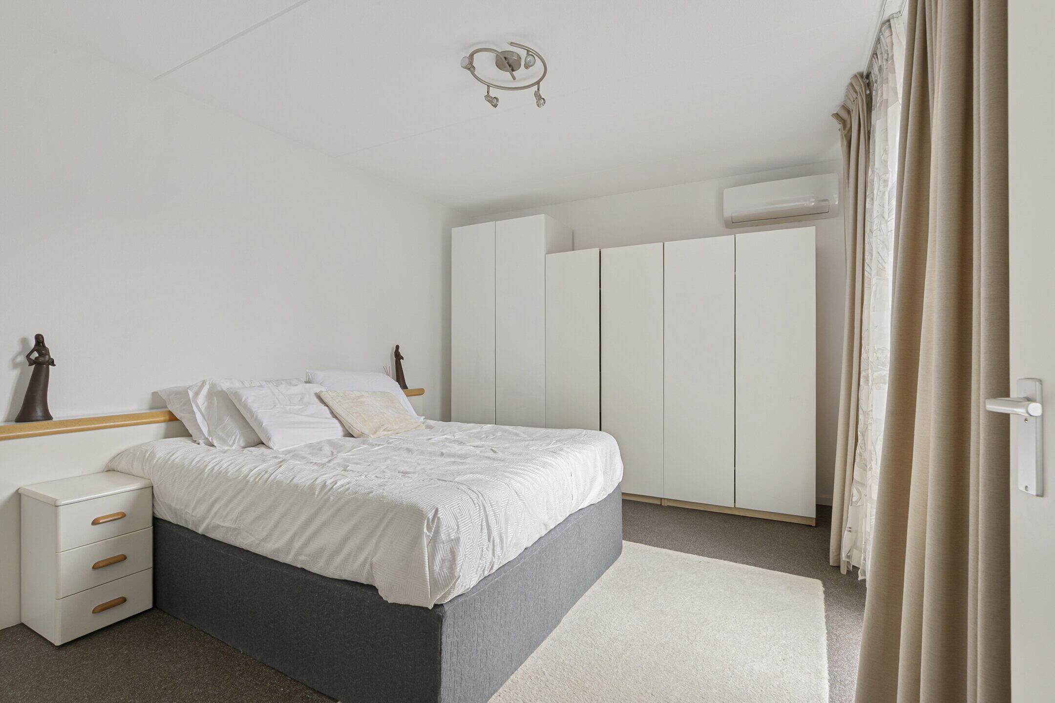 Vanuit de woonkeuken kom je in een tweede hal met toegang tot de garage en de slaapkamer. De ruime slaapkamer heeft zicht op de tuin en is voorzien van een airco en vloerverwarming. Vanuit de slaapkamer kom je in de badkamer welke is voorzien van een inloopdouche, vloerverwarming, het 2e toilet en een dubbele wastafel. De garage wordt nu gebruikt als bergruimte en hier bevindt zich de opstelling van de wasmachine, de droger, de c.v. combiketel en is afsluitbaar d.m.v. openslaande deuren.