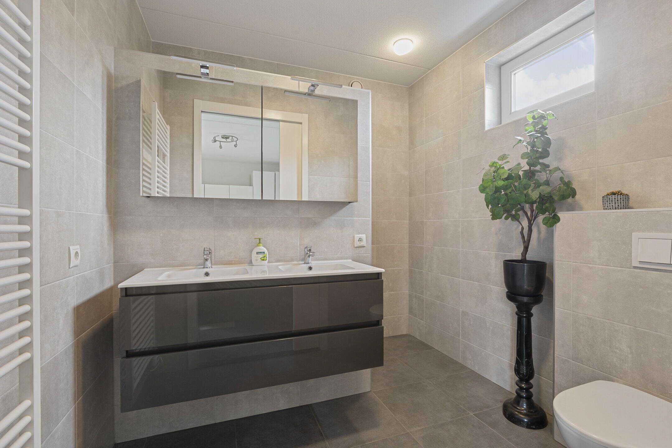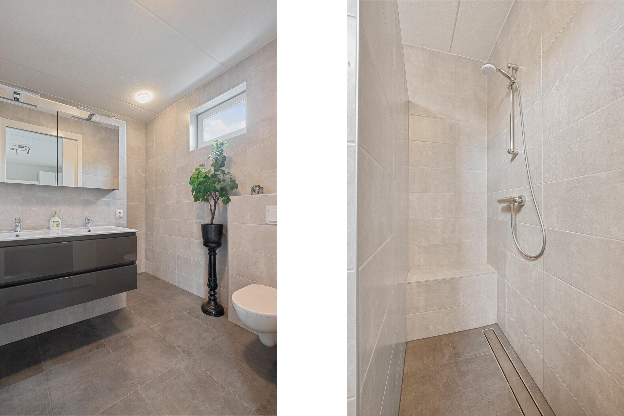 - Toilet, dubbele wastafel, wastafelmeubel, inloopdouche, vloerverwarming toilet, douche, wastafel, vloerverwarming